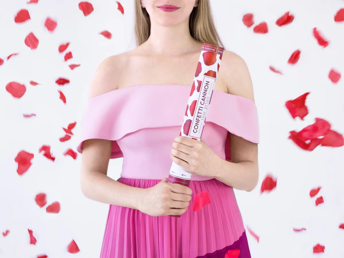Vier het in stijl met ons 40 cm cm lange confettikanon valentijn die bordeauxrode papieren rozenblaadjes de lucht in schiet.